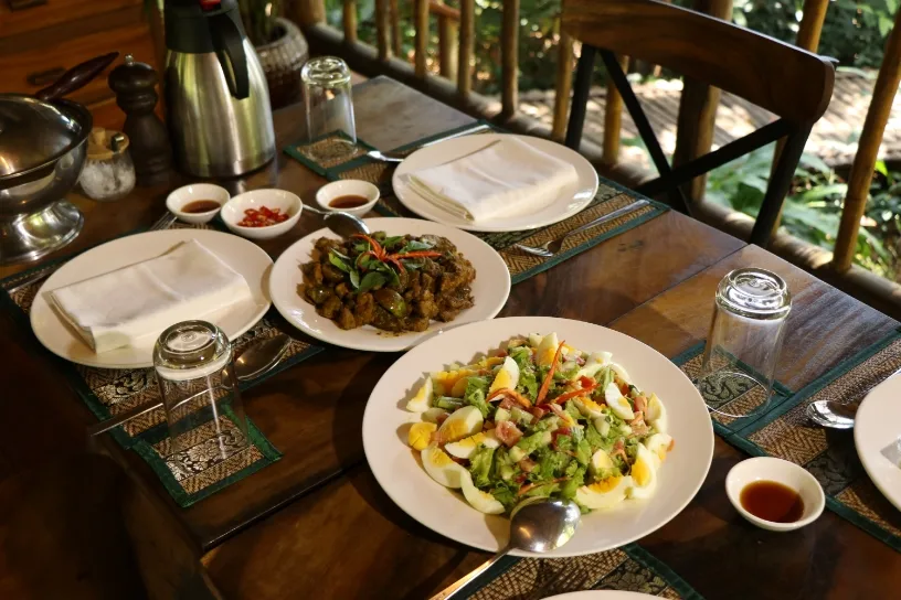 Our kitchen celebrates the rich flavors of Cambodian cuisine. Each day, our cook prepares a menu using locally sourced, seasonal ingredients whenever possible. Guests enjoy home-style meals that reflect Khmer traditions, often featuring recipes shared by our local team or inspired by nearby villages.